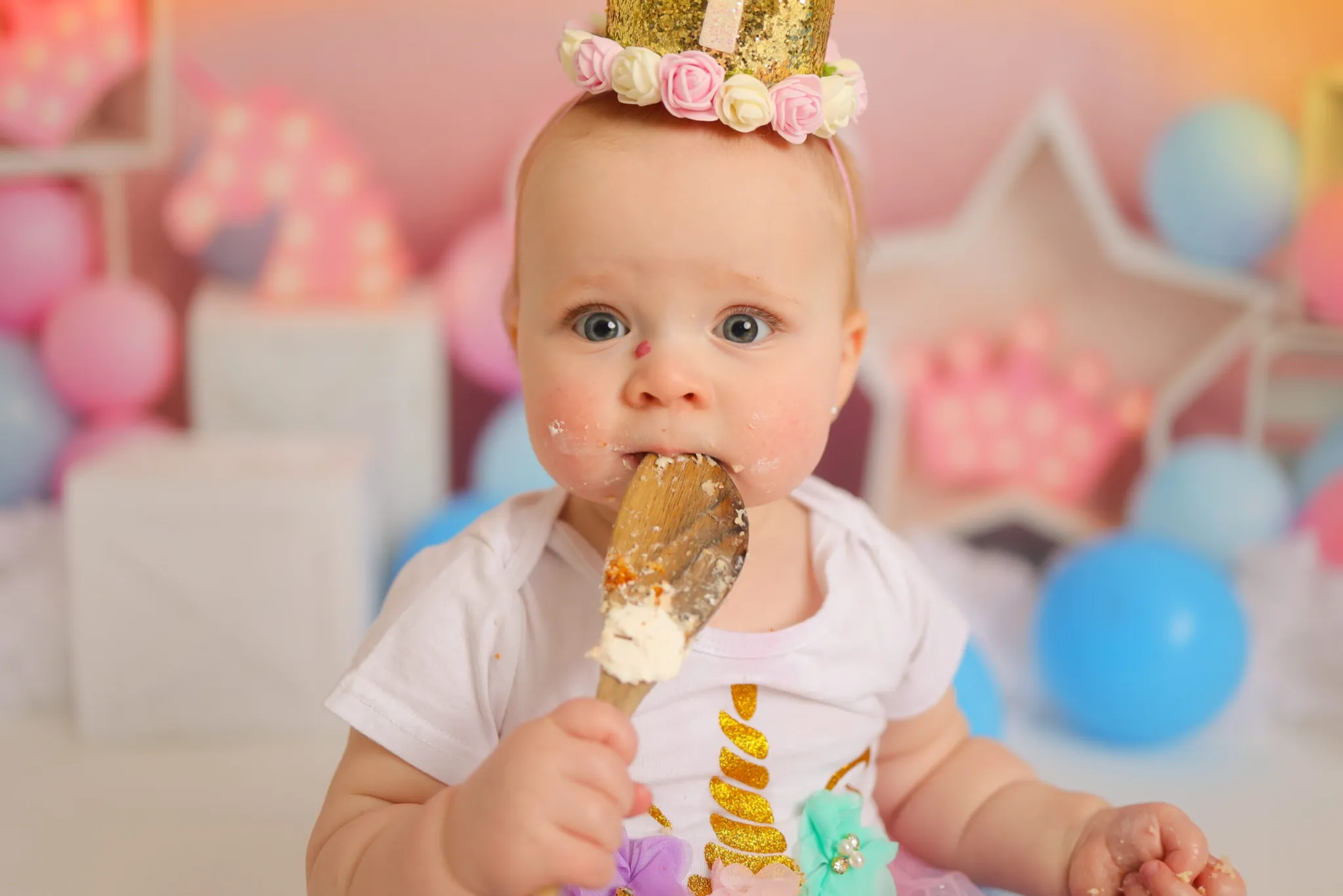 Baby wearing crown sitting with colorful balloons and cake