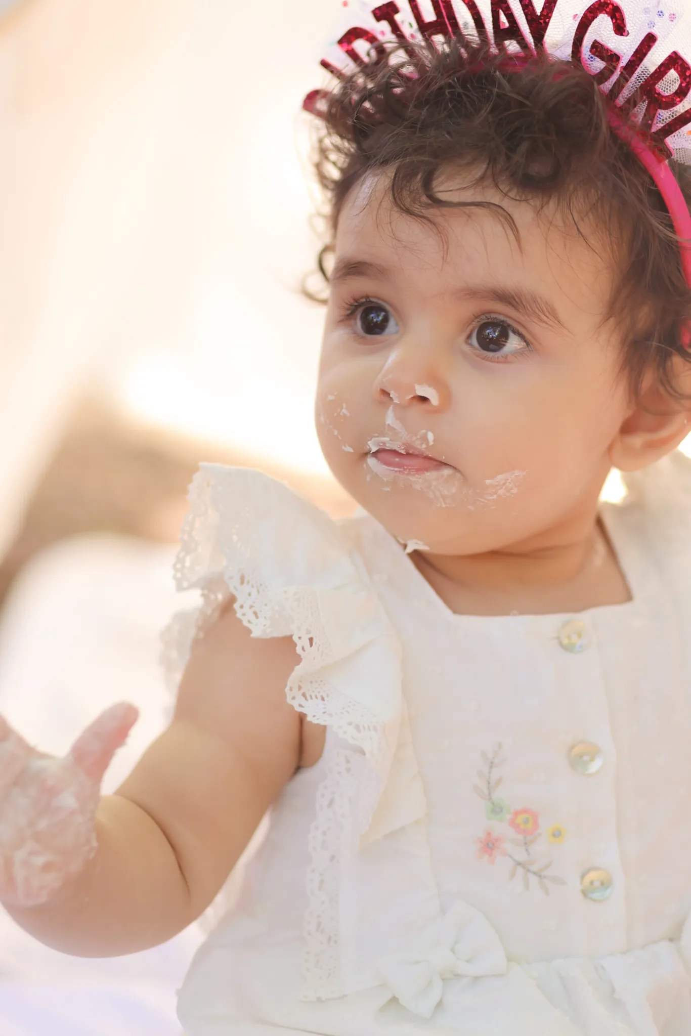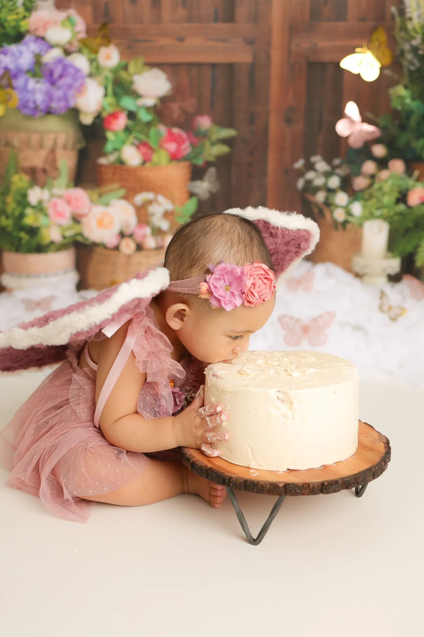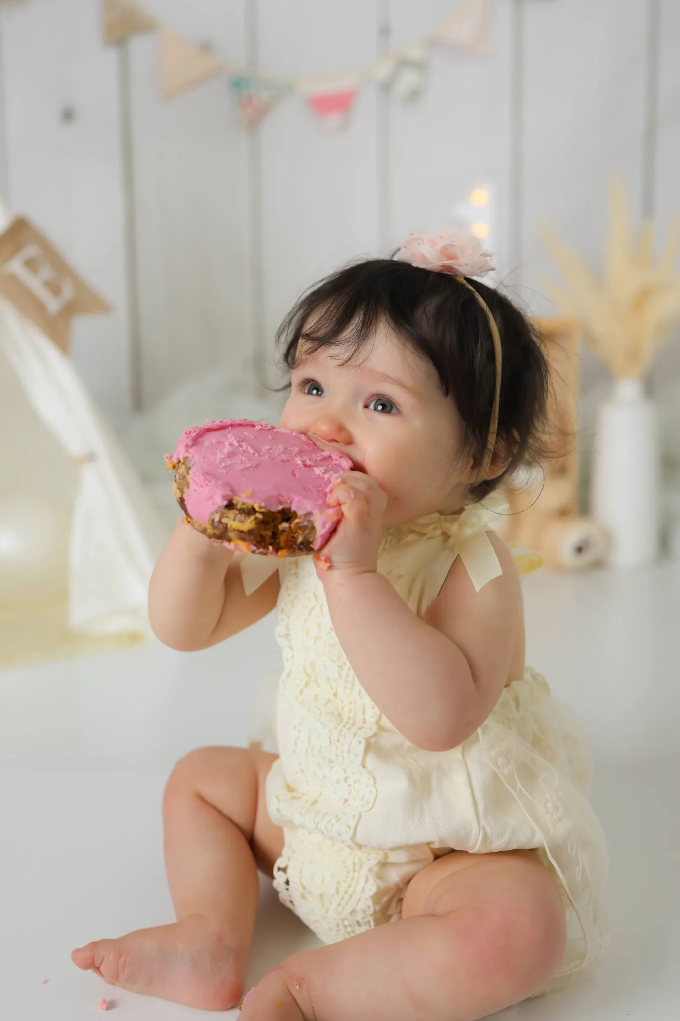 Baby sitting in pink birthday setup with cake