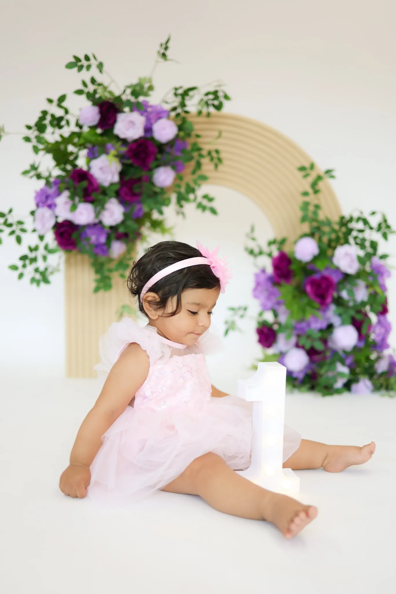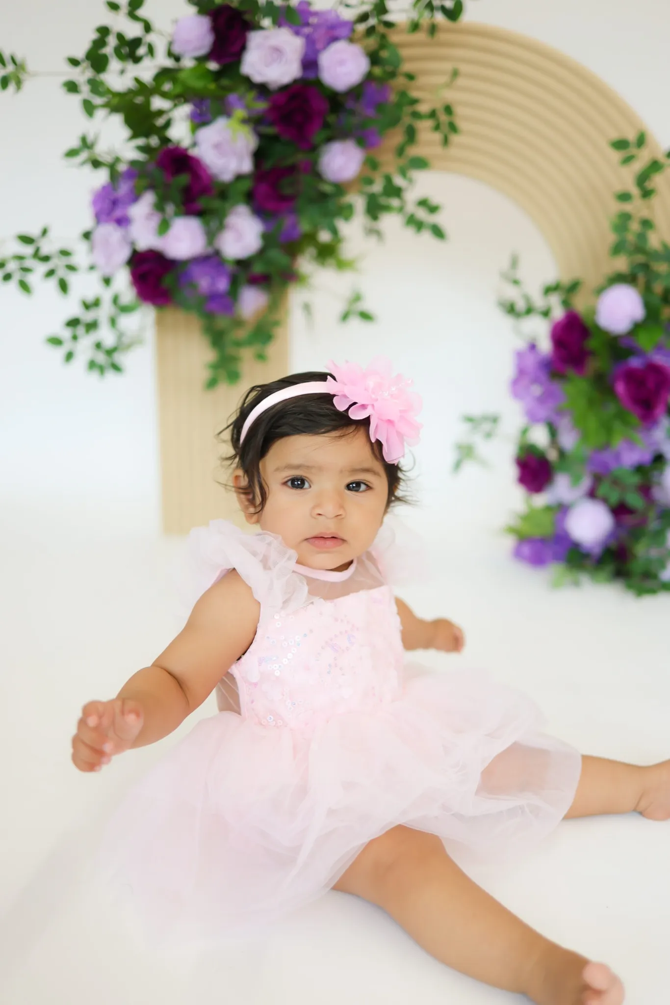 Baby sitting near floral arch during milestone session