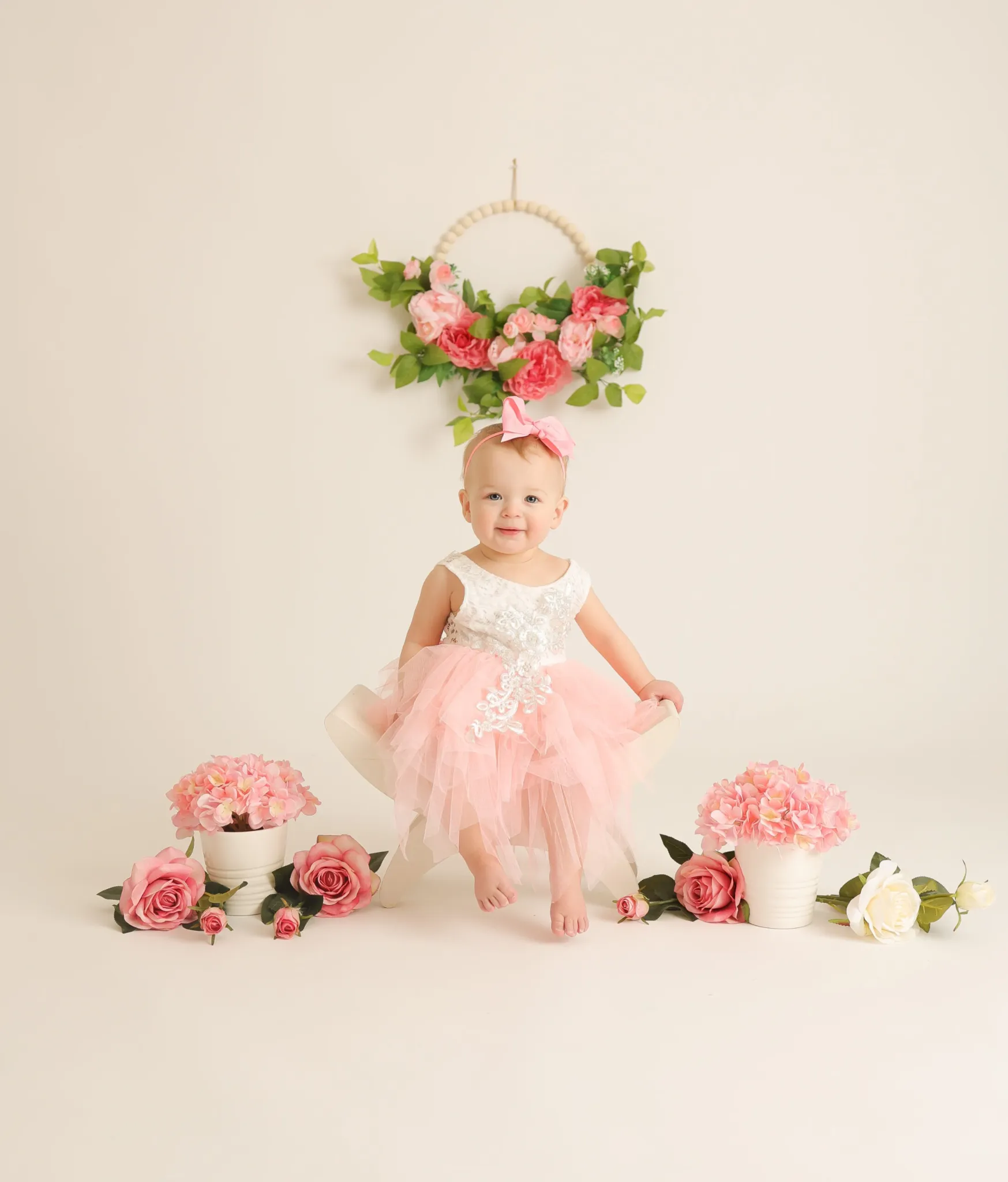 Baby sitting beneath floral arch with soft pink decor