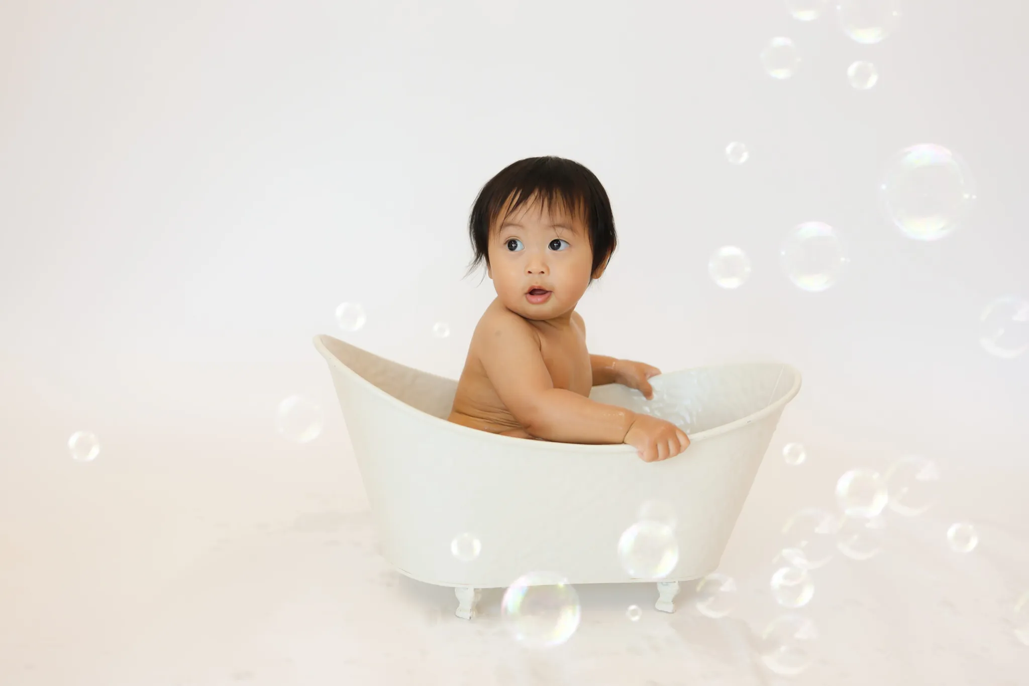 Baby sitting in bathtub surrounded by soft bubbles