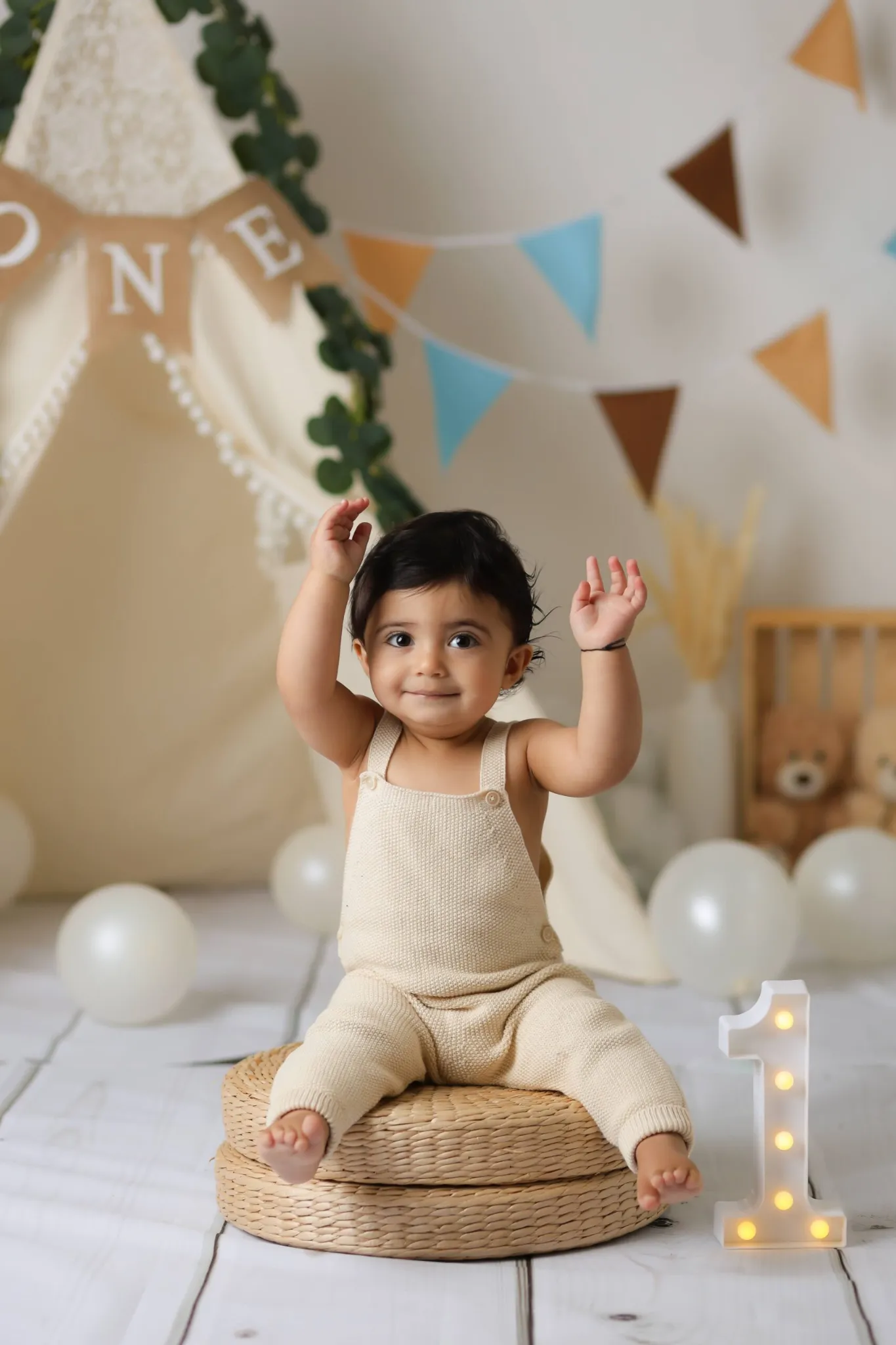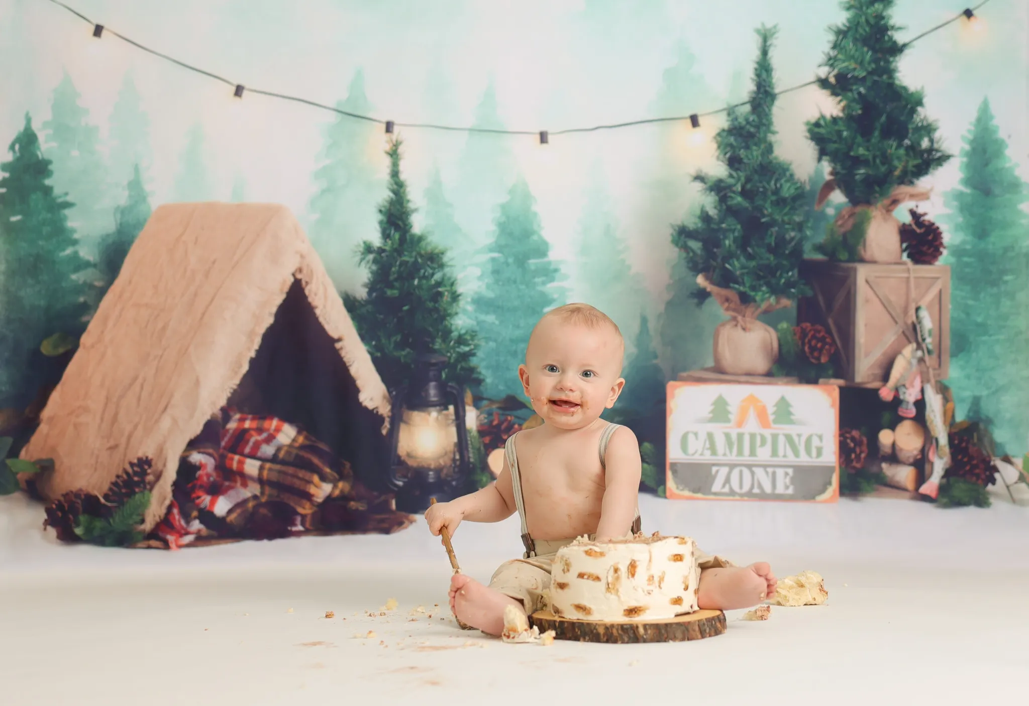 Baby sitting in woodland themed birthday setup with cake
