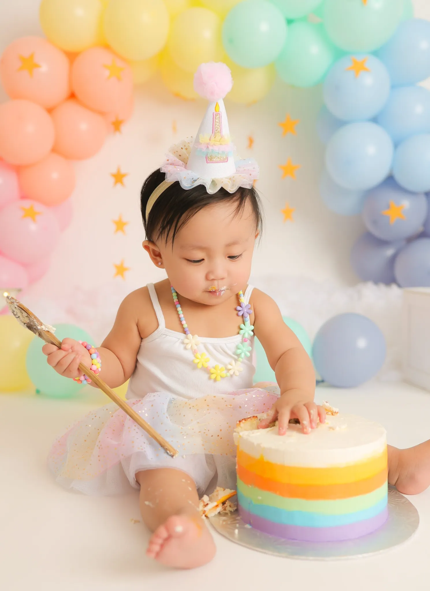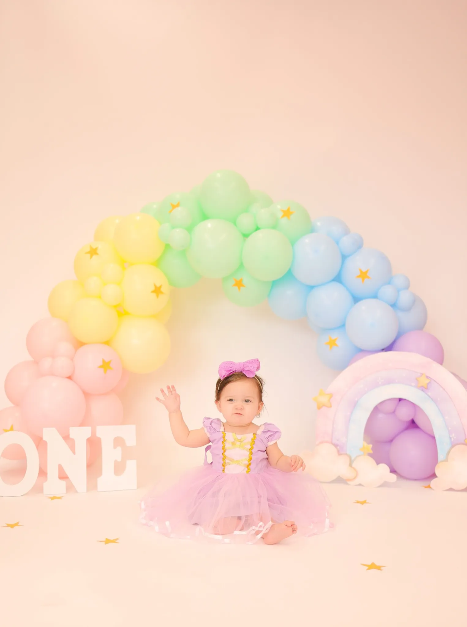 Baby sitting under pastel balloon arch during birthday sessio