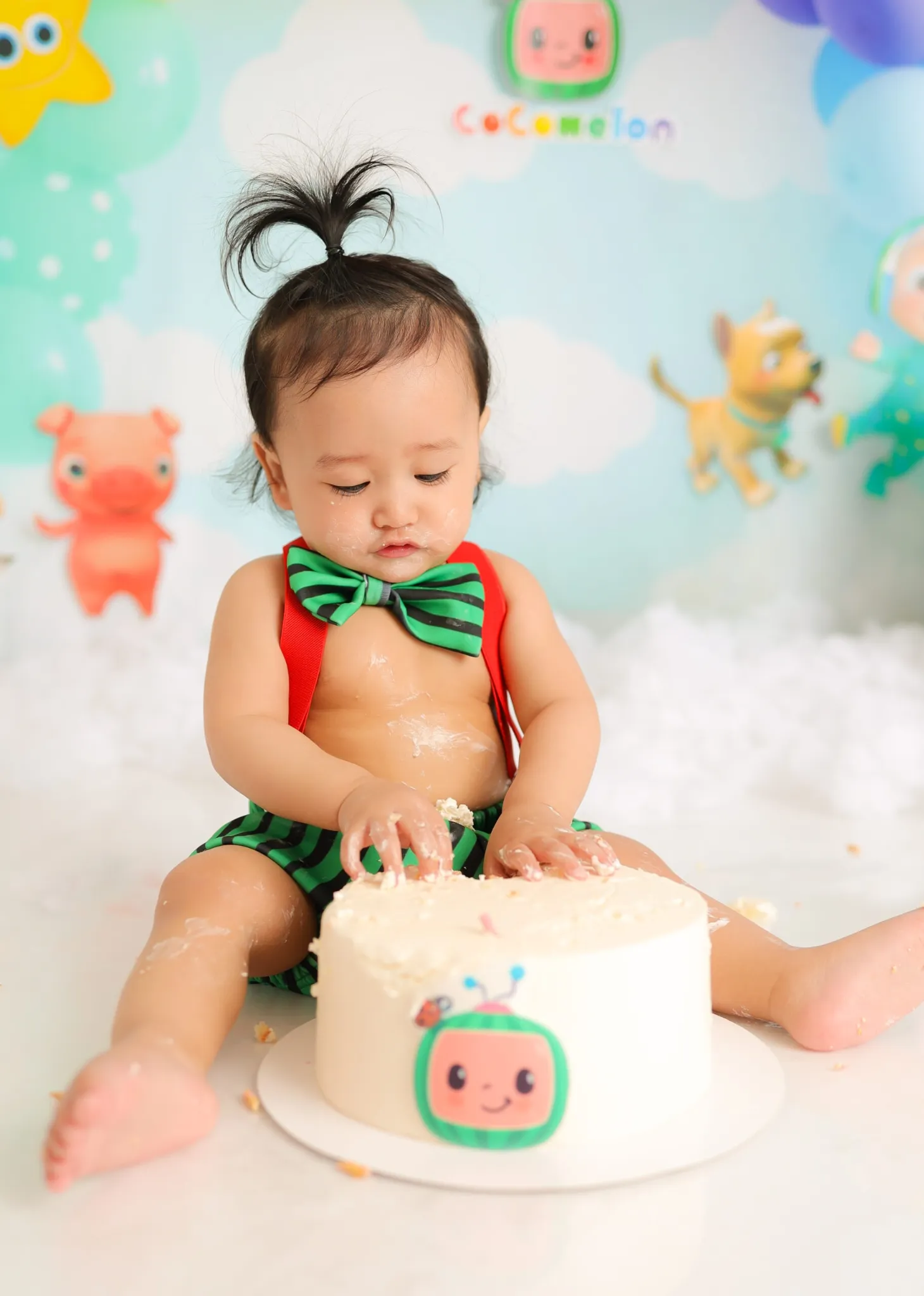 Baby sitting with cake during colorful cake smash session