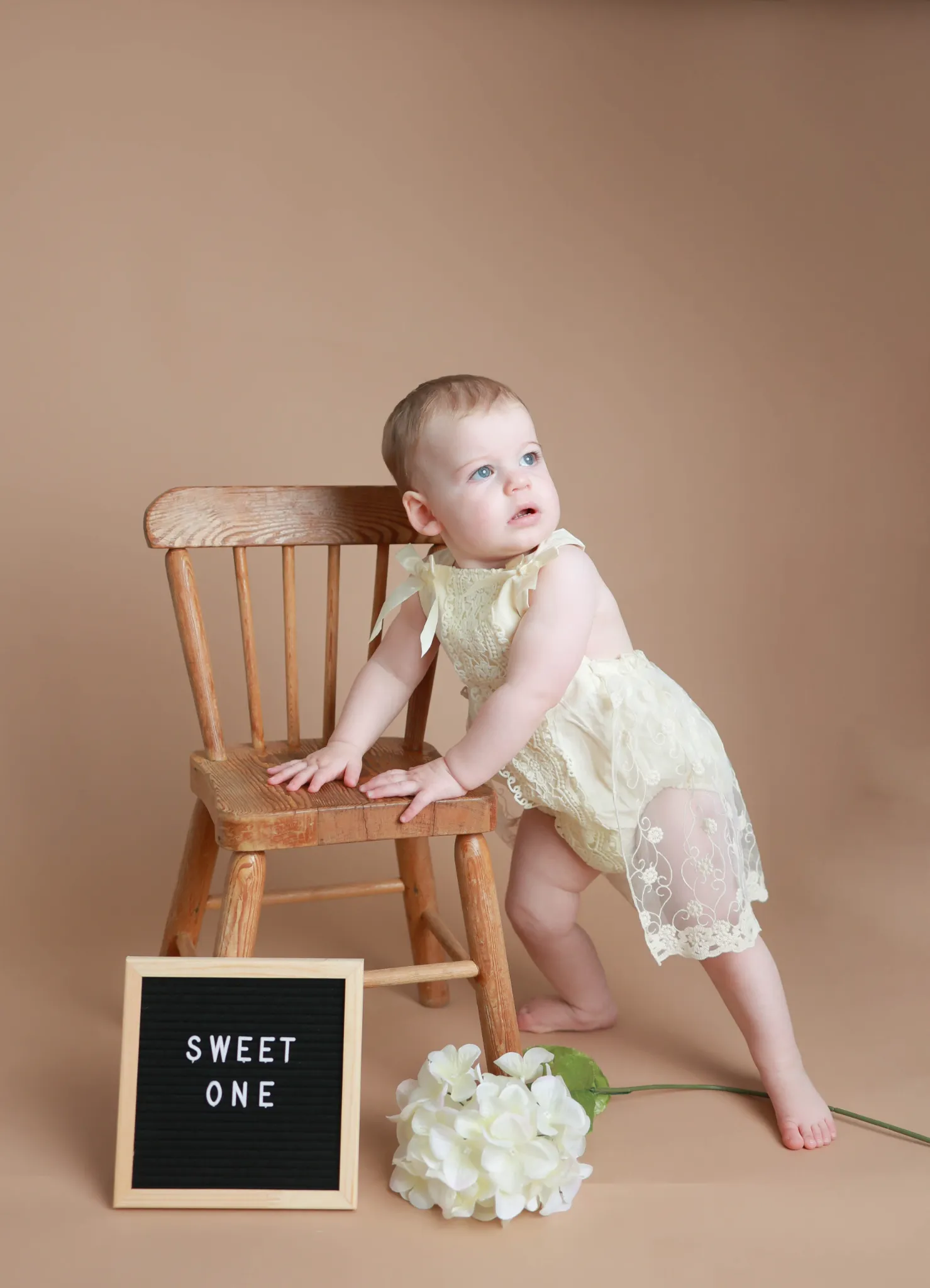 Baby standing beside chair with sweet one sign