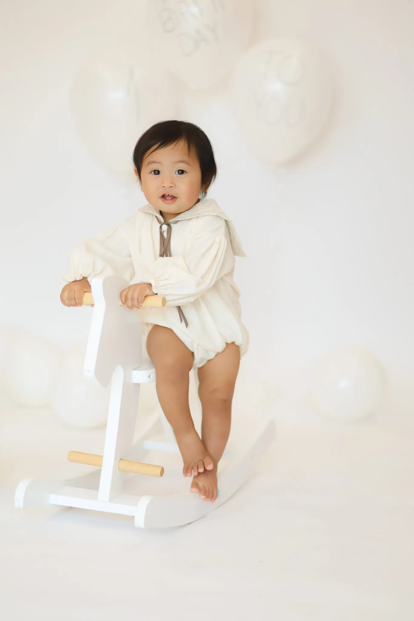 Baby sitting on floor with balloon backdrop during milestone session