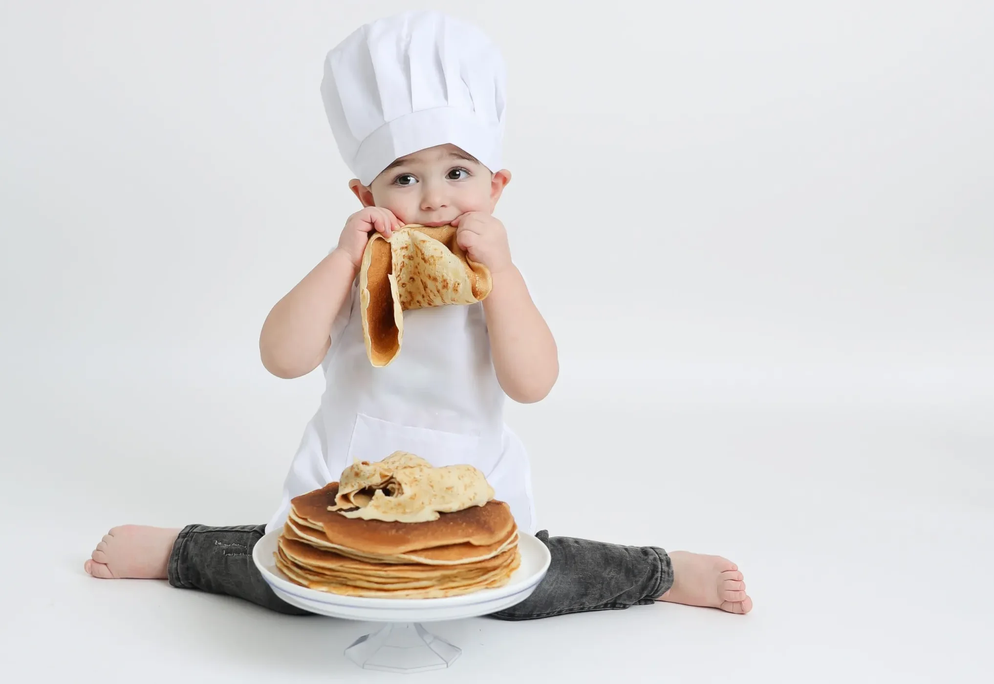 Child wearing chef hat sitting with stacked pancakes e1768938467218