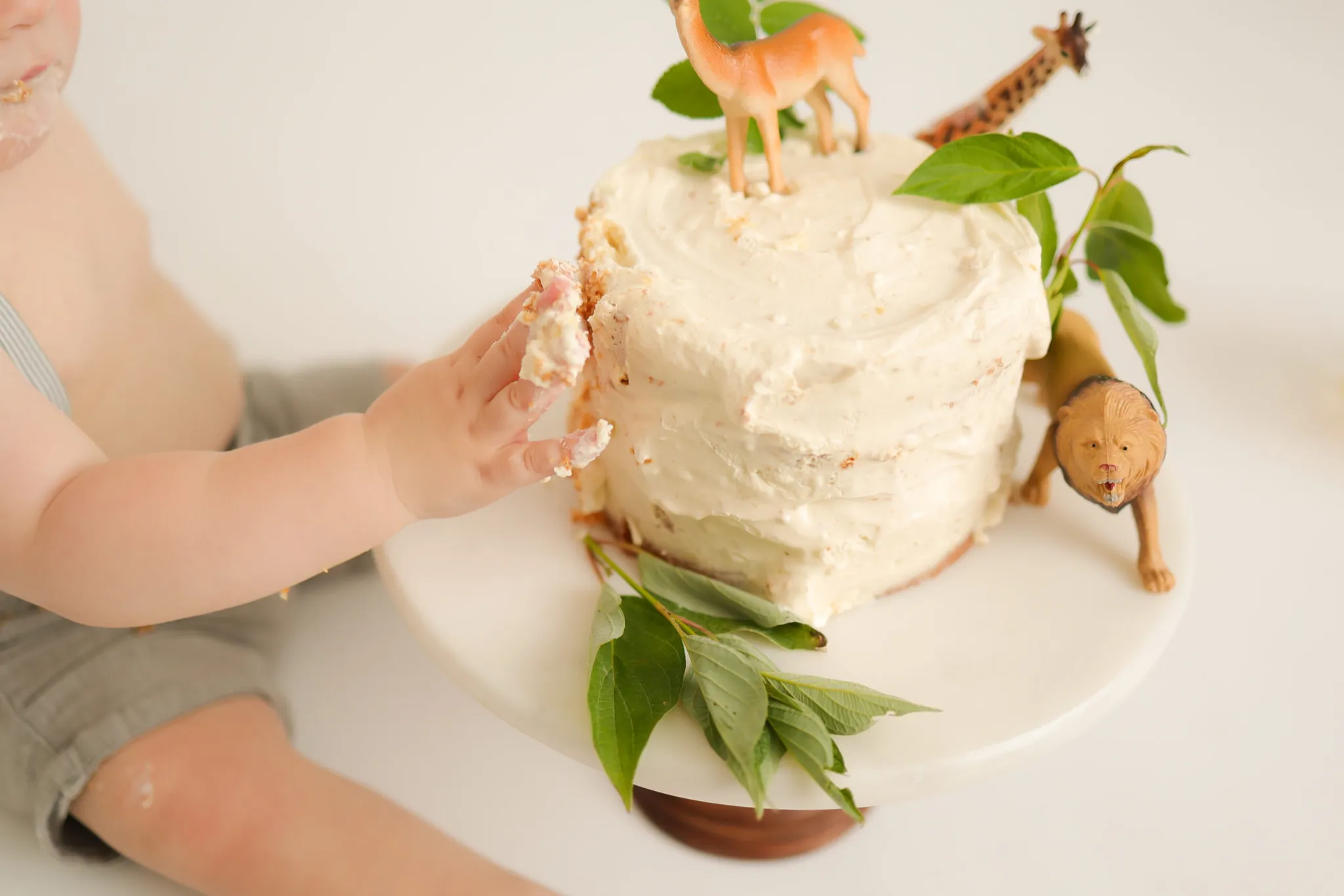 Close up of hands touching cake during cake smash session